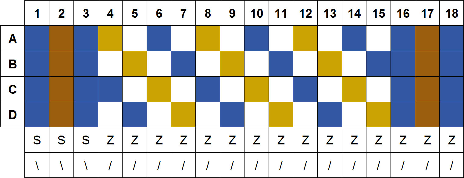 Det går åt 12 gula trådar, 8 bruna trådar och 28 blåa trådar.