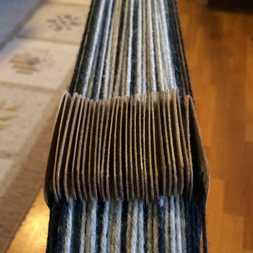 Banden hade ett vackert flätat mönster. Nu är det varpat och klart med inte mindre än 112 trådar och 28 brickor. Jag valde att göra det i ull – inget färggrant men naturligt gråa färger kan aldrig gå fel.